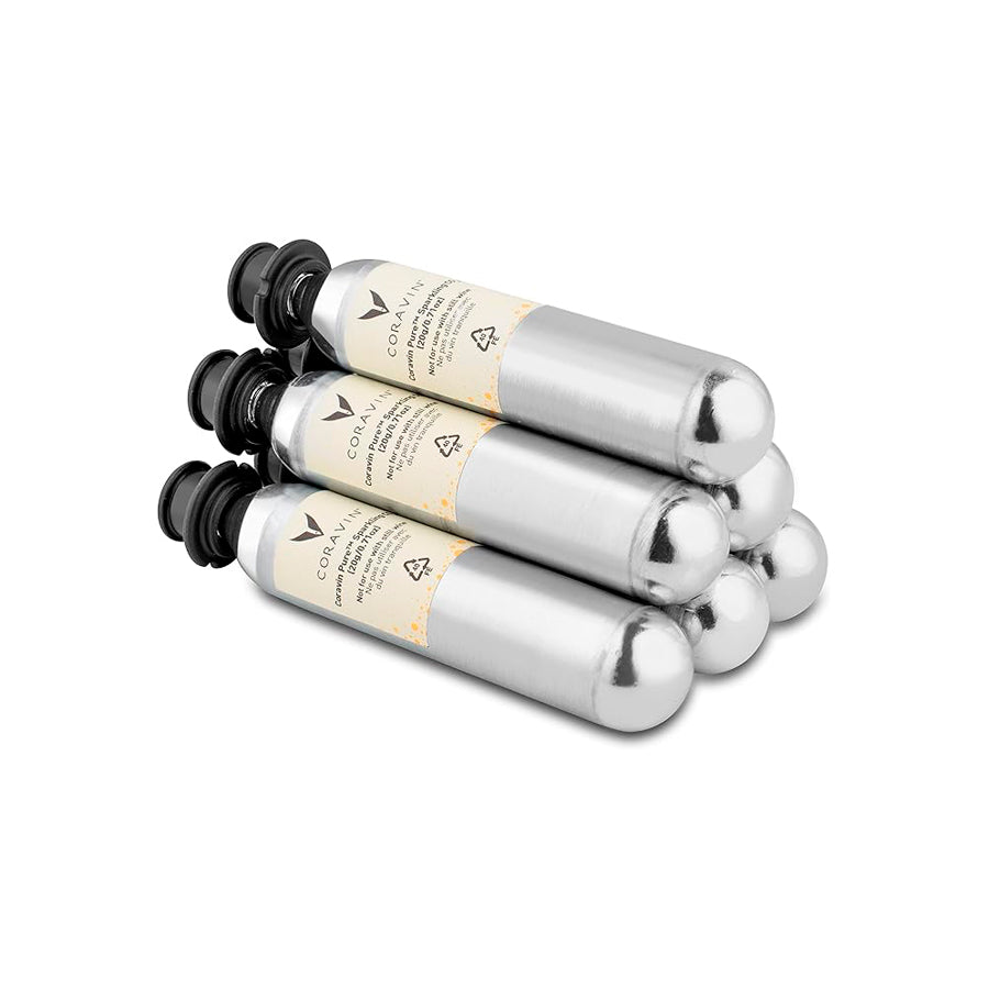 Estas cápsulas de repuesto están llenas de CO2 puro, el mismo gas que crea burbujas en el vino espumoso, para preservar su sabor y efervescencia hasta por 4 semanas. Cada cápsula conserva hasta 7 botellas estándar de vino espumoso.