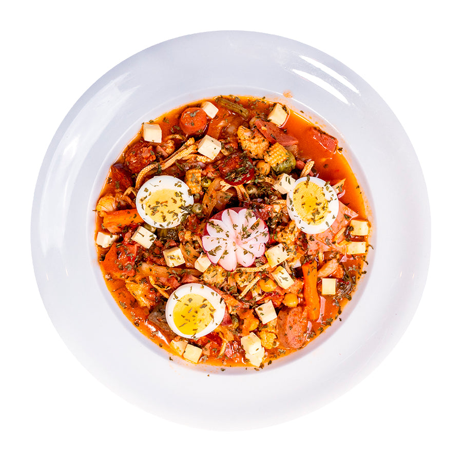 Mezcla de embutidos, carnes, quesos y vegetales encurtidos con la vinagreta original de Vinoteca.
