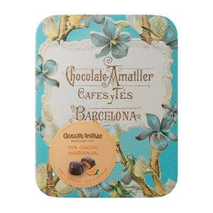 Delicioso bombón elaborado por Chocolate Amatller, esculpido en forma de flor y relleno a base de zumo de naranja natutal, ideal para quienes les gusta la combinación de chocolate y fruta. Bombones recubiertos de chocolate 70% cacao, con un ligero interior a base de zumo de naranja natural.